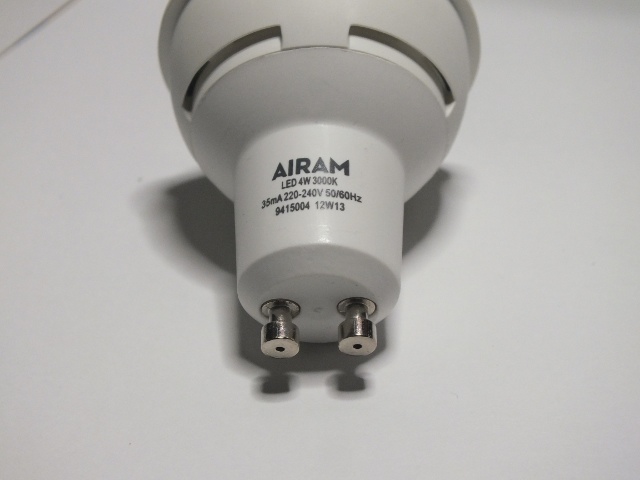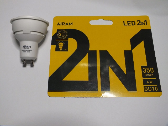 I found suitable looking product AIRAM LED 4W GU10 350LM 2KPL 43-8924 from local Motonet shop. The 9,90 Euro package contains two LED lamps, so one bulb will end up costing slightly less than 5 Euros. That’s very reasonable price for brand with some reputation. Airam is a Finnish company and I have heard good comments on their LED product earlier.