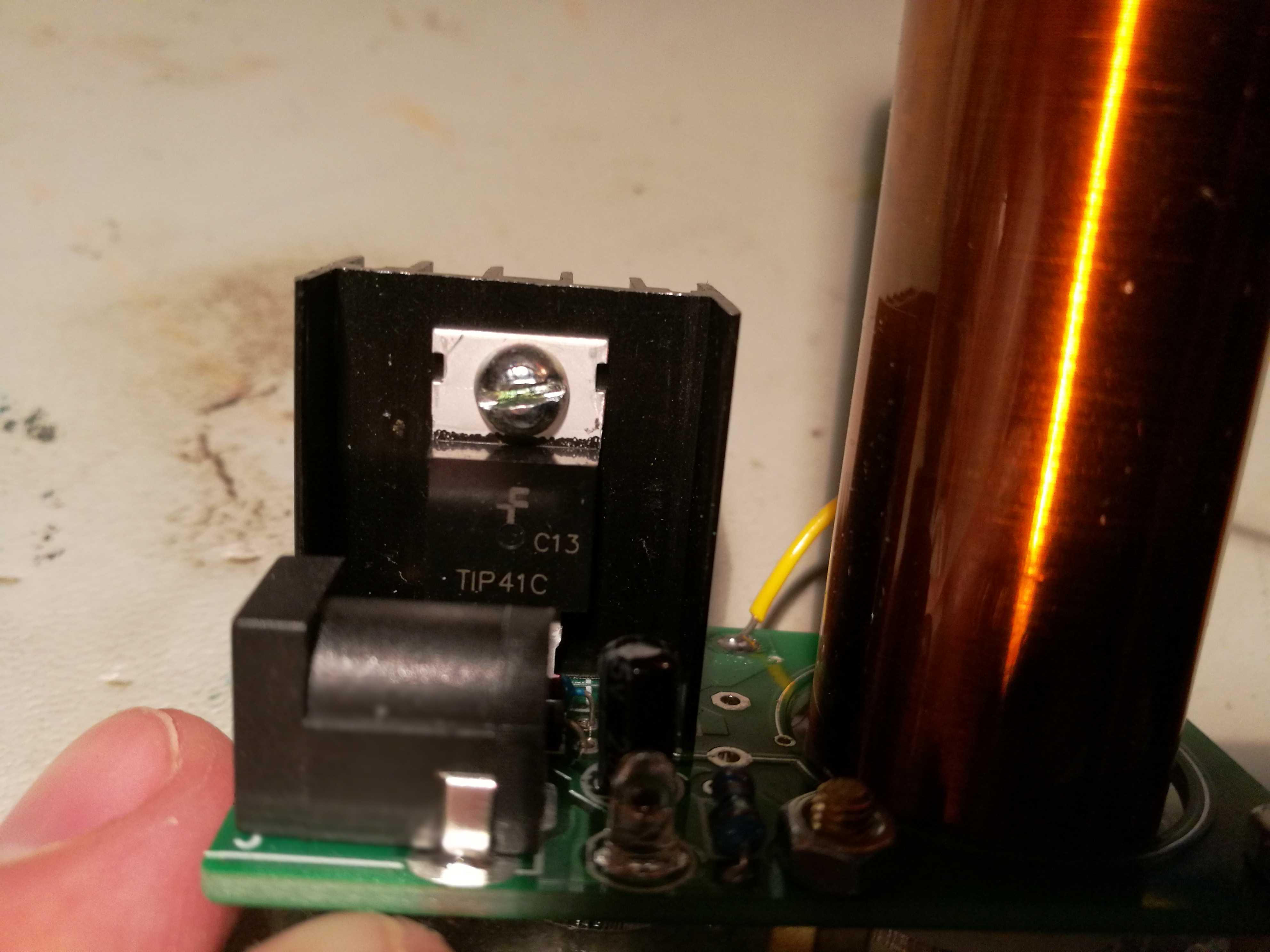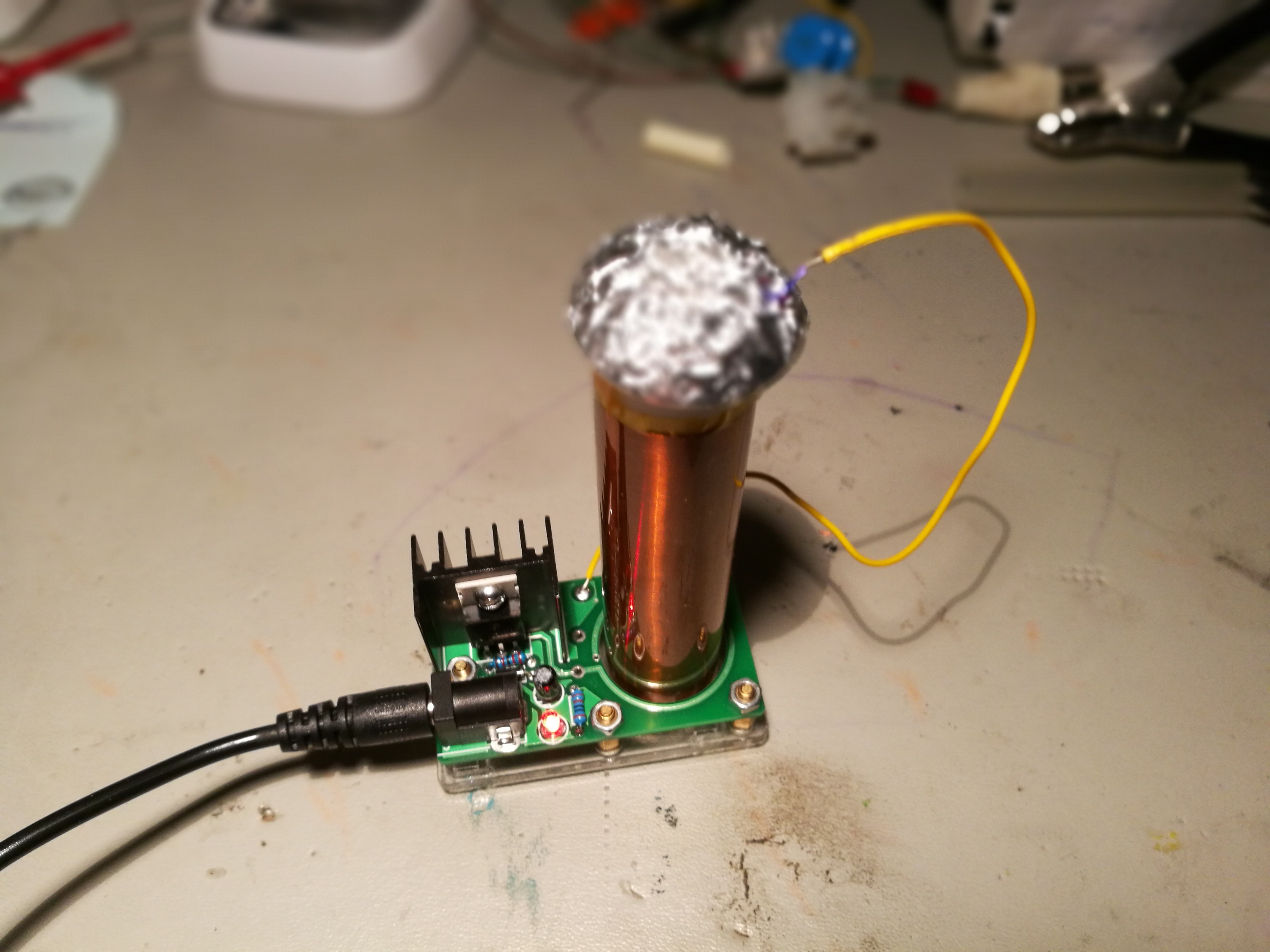 The electronics is pretty simple: One power transistor, few passives and the Tesla secondary coil: