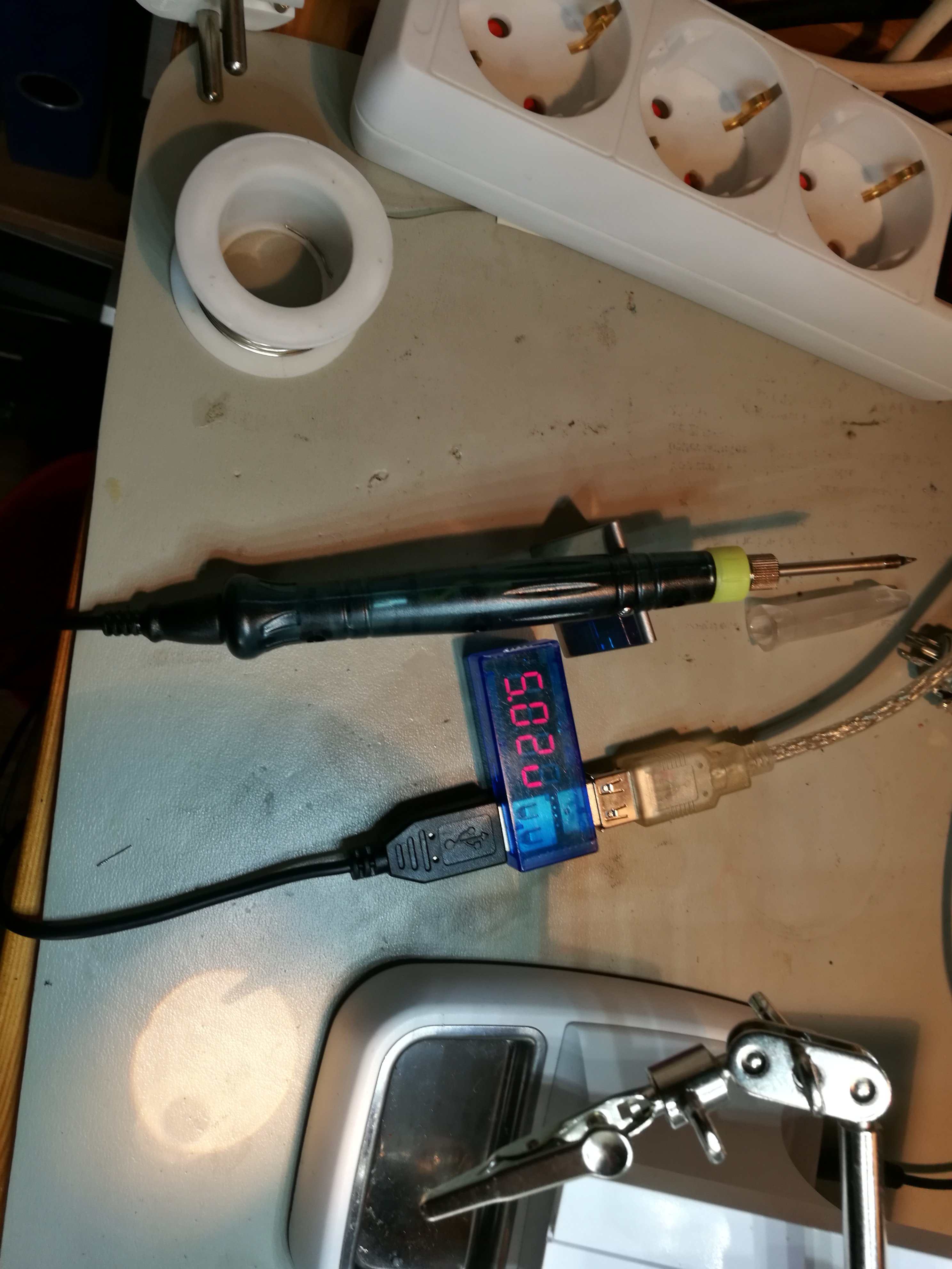 Note on USB chargers: Check that you use USB charger that does not have too much leakage current from mains to the USB output, because the soldering iron tip is in electrical contact with soldering iron tip. Too much leakage current can damage sensitive components on the circuit board you are soldering.