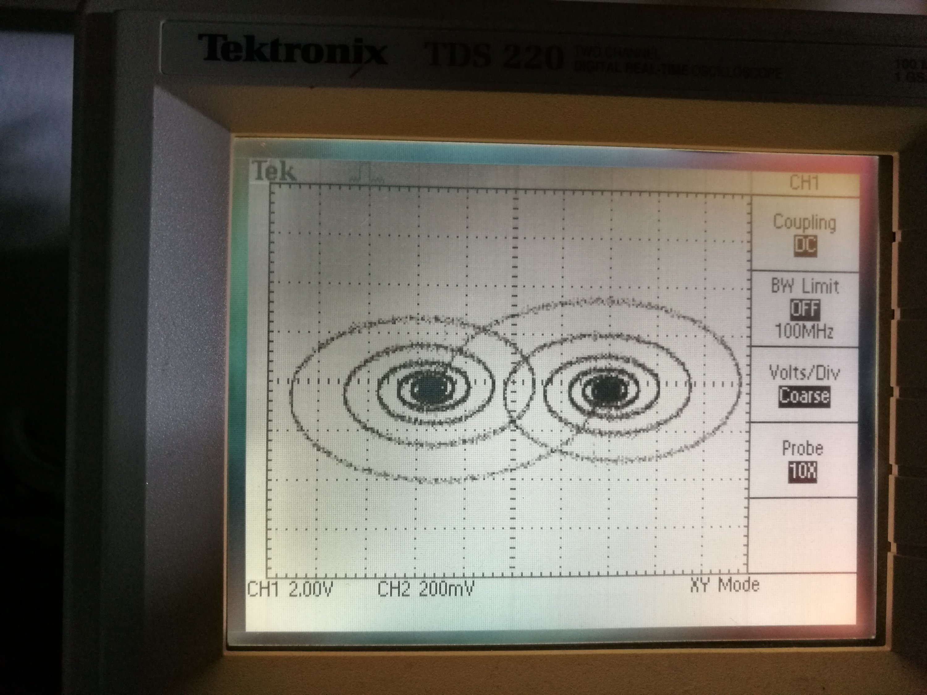 Then I got this nice graphics on digital oscilloscope screen in XY mode.