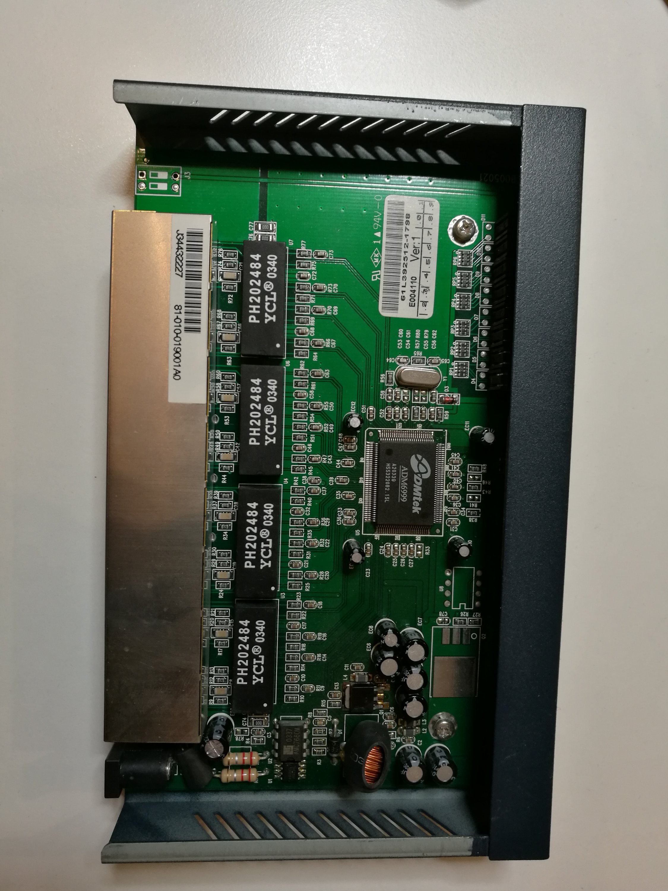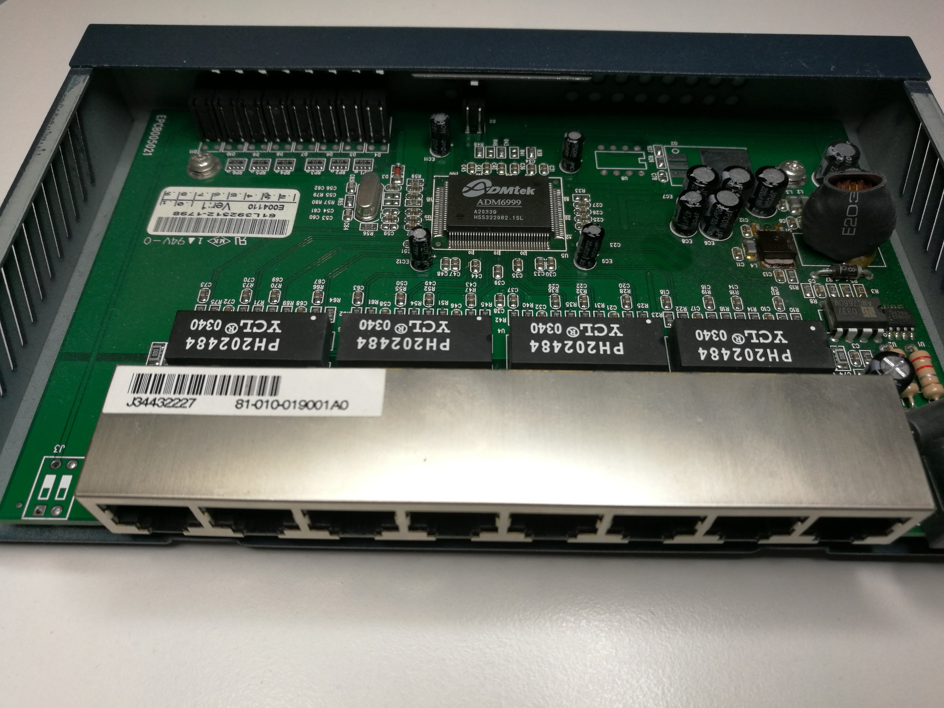 Main Ethernet switch chip is ADM6999 from ADMtek (now part of Infineon). In addition to it line transformers and power supply, not much more.