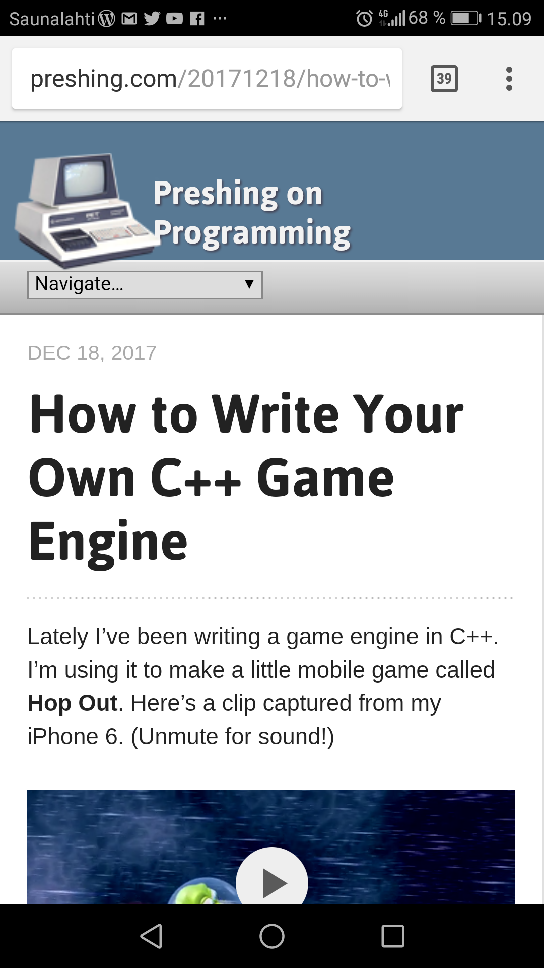 This article tells about writing your own game engine in C++. The aim here is to get arcade gameplay with a 3D cartoon look. The first piece of advice is to get something (anything!) running quickly, then iterate. Using SDL, it was easy to get a lovely spinning cube using OpenGL ES 2.0. Then start improving it.