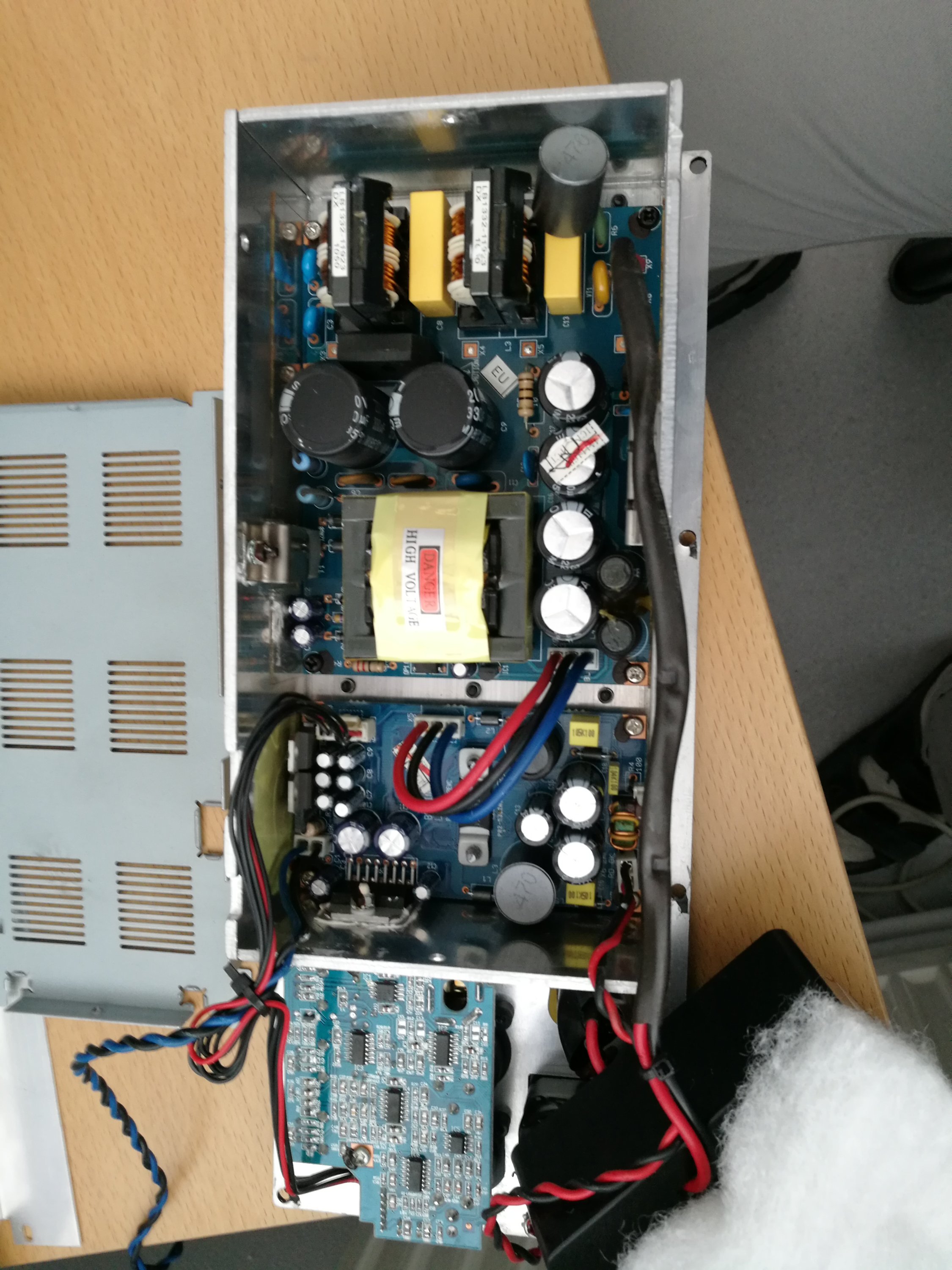 Amplifier board has 160W class D amplifier chip (below board and possibly broken) for driving low frequency speaker element, 40W power amplifier IC for high frequencies and power regulator for +-15V preamp power.