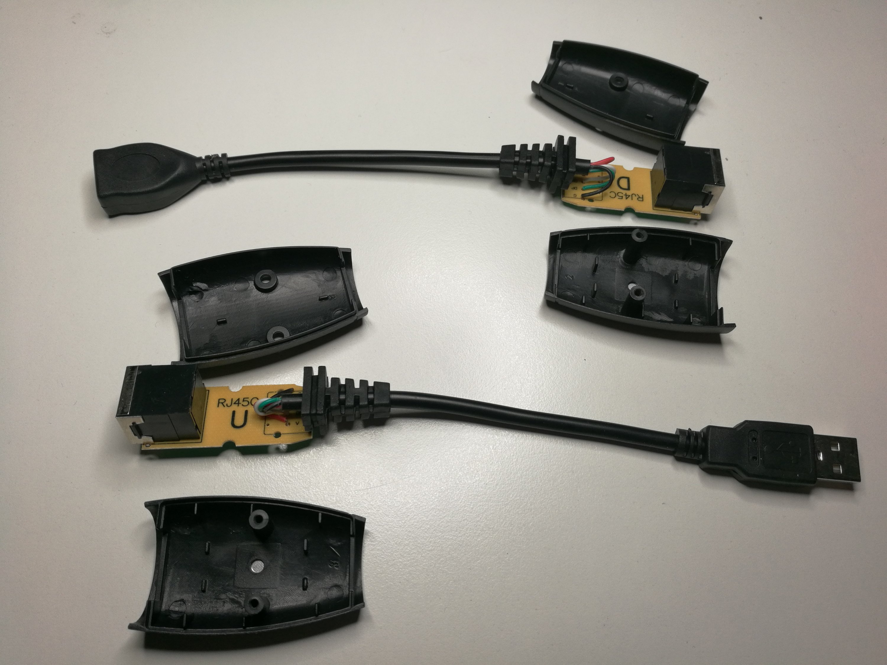 The hardest part was desoldering the Hubs from the salvaged PCB board, after that it was just a matter of selecting which cables of the CAT5 use to solder the Usb plugs and the RJ45 Hubs.