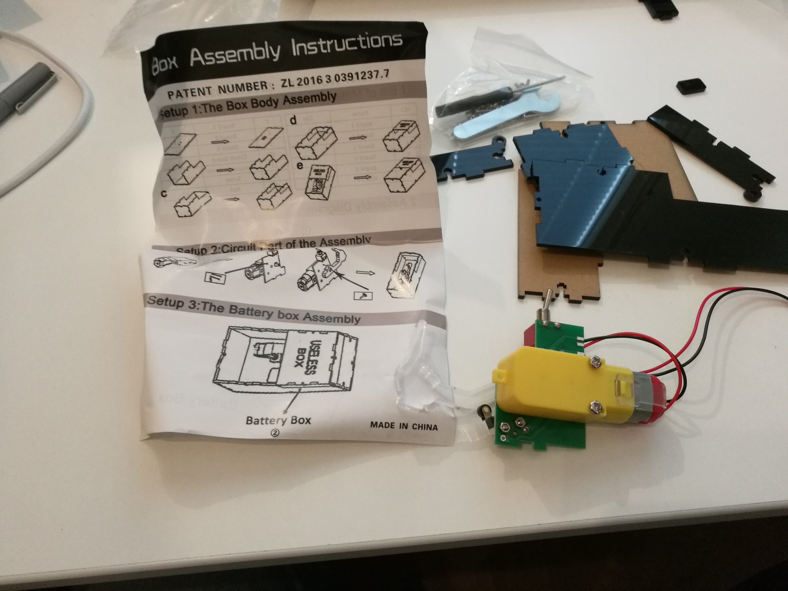 Having the basic parts around to build such device. The basic electrical parts would be easy, just two switches and one motor. To get the mechanical construction right is the harder part. To get over mechanical design challenge, I ended getting a ready made kit: Useless Box DIY Kit Useless Machine Birthday Gift Toy Geek Gadget Fun Office Home Desk Decor.