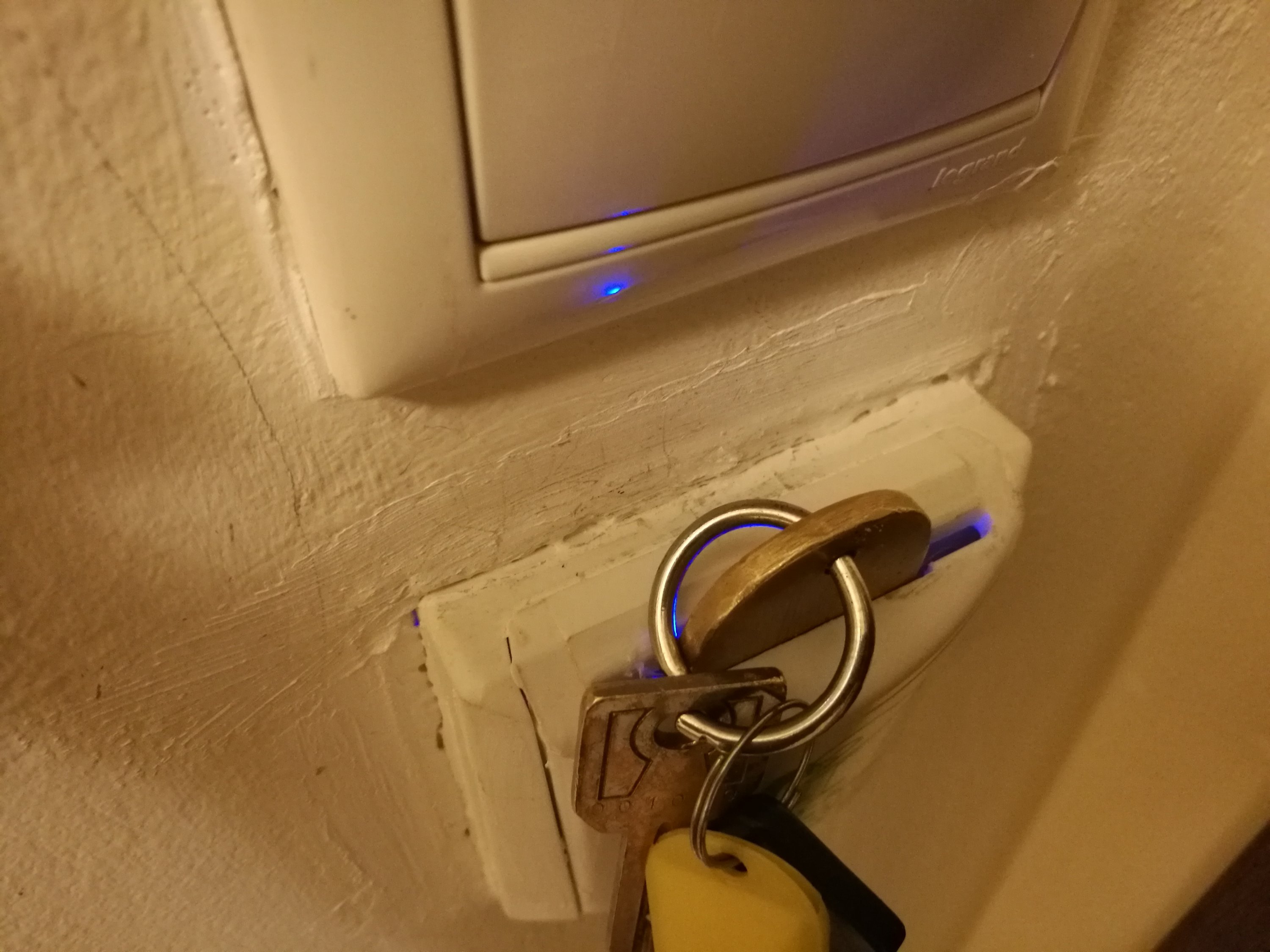 Hotel room distribution panel and keychain that turns power when you are in room. This panel has main breaker (two pole), ground fault protection and indicator light on lower row. Upper row has single pole breakers and power controller.