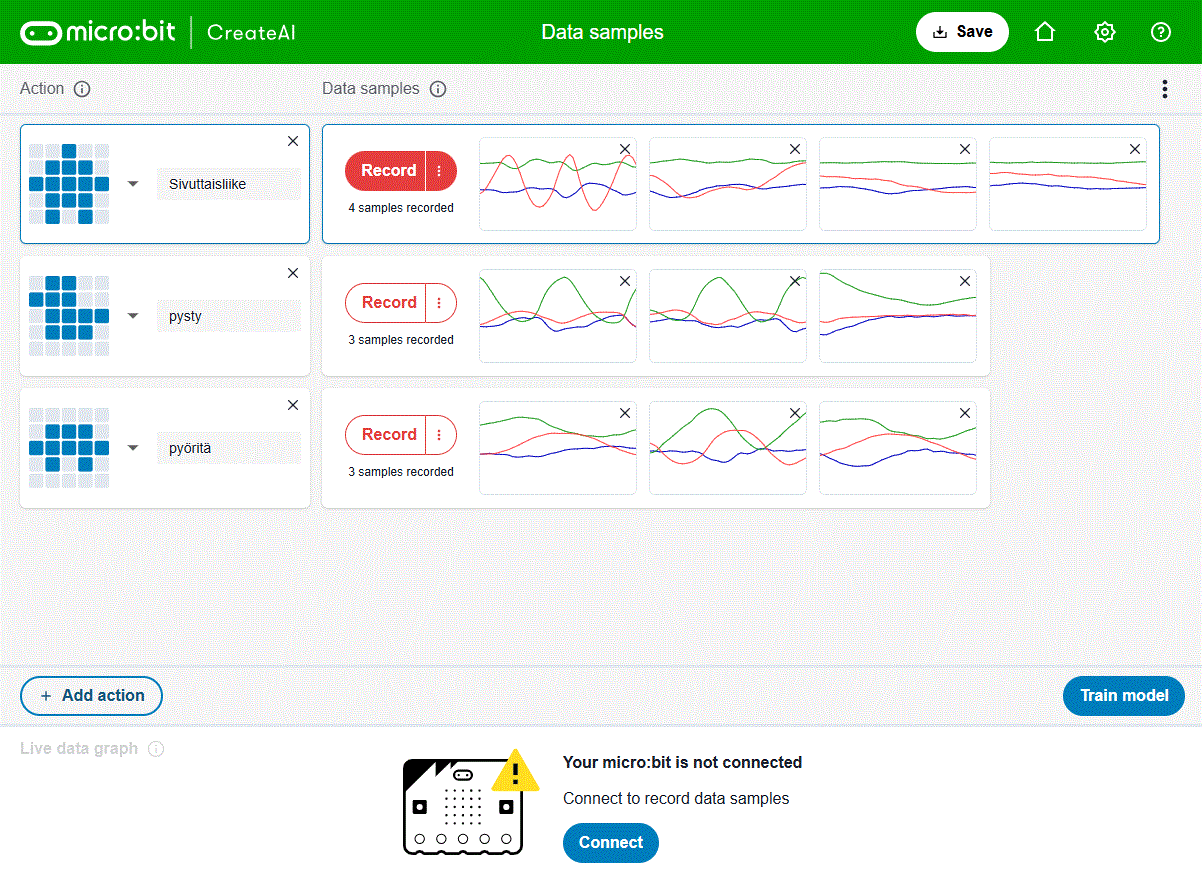 micro:bit CreateAI is a free, web-based tool that lets you program a micro:bit to recognise and respond to your movements, like clapping, waving, dancing or jumping. The movement data used for AI model teaching is recorded from the micro:bit’s accelerometer and transported to PC using Bluetooth. The recorded data is used to train, test and improve your own machine learning model, then use it in a Microsoft MakeCode tool that is used to program the micro:bit board.