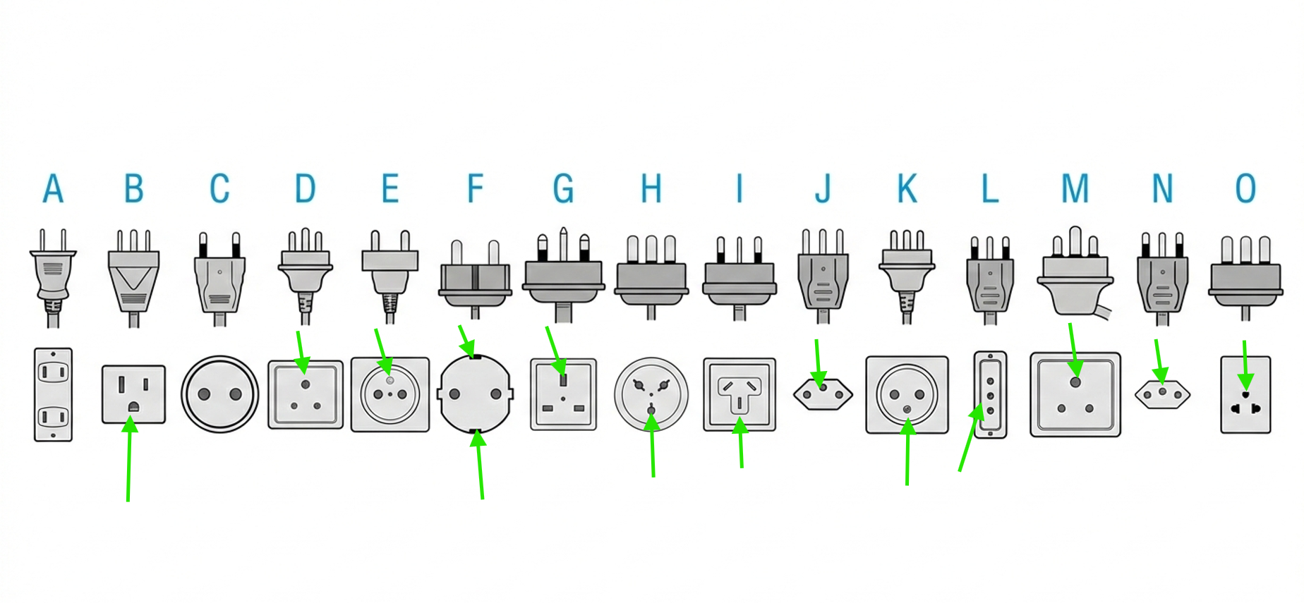Here is an overview of the electrical outlets around the world in table format and drawing of different outlet types. The grounding contacts are marked to the picture with green arrows.