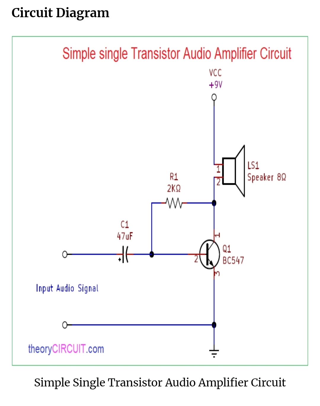 This single BC547 (NPN) Transistor based audio amplifier circuit has been designed to be constructed as a experiment. It is far from ideal for real use, but works as quick experiment. Input Audio signal for the first circuit is applied to the BC 547 base through Capacitor C1 (47µF) to transistor base. The transistor Collector is connected to speaker. There is a 2.2 kohm resistor between collector and base to bias the transistor. The audio is sent to speaker by changing the current that flows from transistor collector to emitter to match the input audio signal (class A amplifier). The downside of this design is that there will be constant current though the speaker all the time (DC in speaker is not good, too much will cause distortion and burn the speaker voice coil).