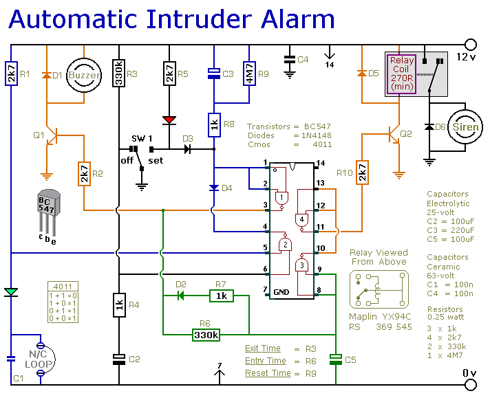 This is a simple single-zone burglar alarm circuit. Its features include automatic Exit and Entry delays and a timed Bell/Siren Cut-Off. It's designed to be used with the usual types of normally-closed input devices such as - magnetic reed contacts - micro switches - foil tape - and PIRs. But it can be Easily Modified to accept normally-open triggering devices - such as pressure mats.