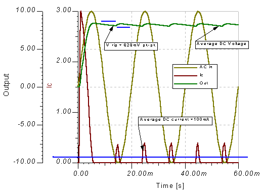 where I load is the DC current measured through the load in amps and C is the value of the capacitor in uF.The diagram below shows an example with a load current of 0.1 amp and a smoothing capacitor value of 1000uF.